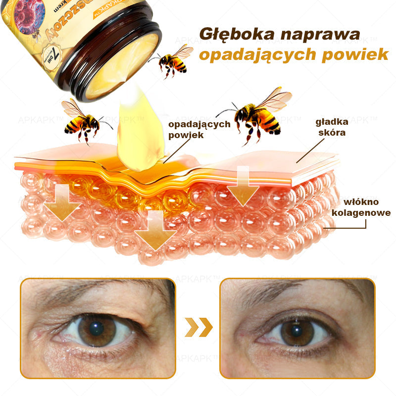 ΑPKAPK® Jad Pszczoły Kompleksowy Krem łączy nowoczesną technologię z unikalnymi składnikami, aby skutecznie działać na opadające powieki i głęboko je regenerować. W przeciwieństwie do typowych produktów dostępnych na rynku, ΑPKAPK® Jad Pszczoły Kompleksowy Krem nie tylko stymuluje produkcję kolagenu, poprawiając elastyczność delikatnej skóry wokół oczu, ale także wykorzystuje peptydy jadu pszczelego, które dokładnie naśladują działanie botoksu. Dzięki temu rozluźnia mięśnie wokół oczu i podnosi opadające powieki. Unikalna formuła głęboko penetruje skórę, wspomaga krążenie krwi, a razem z głęboko nawilżającym działaniem kwasu hialuronowego zapewnia, że skóra wokół oczu wygląda pełniej i bardziej jędrnie. Skutecznie redukuje opadające powieki, nadając oczom młodszy, jędrniejszy wygląd. Wybierz ΑPKAPK® Jad Pszczoły Kompleksowy Krem, aby doświadczyć prawdziwej innowacji w pielęgnacji skóry i całkowicie pożegnać się z opadającymi powiekami.